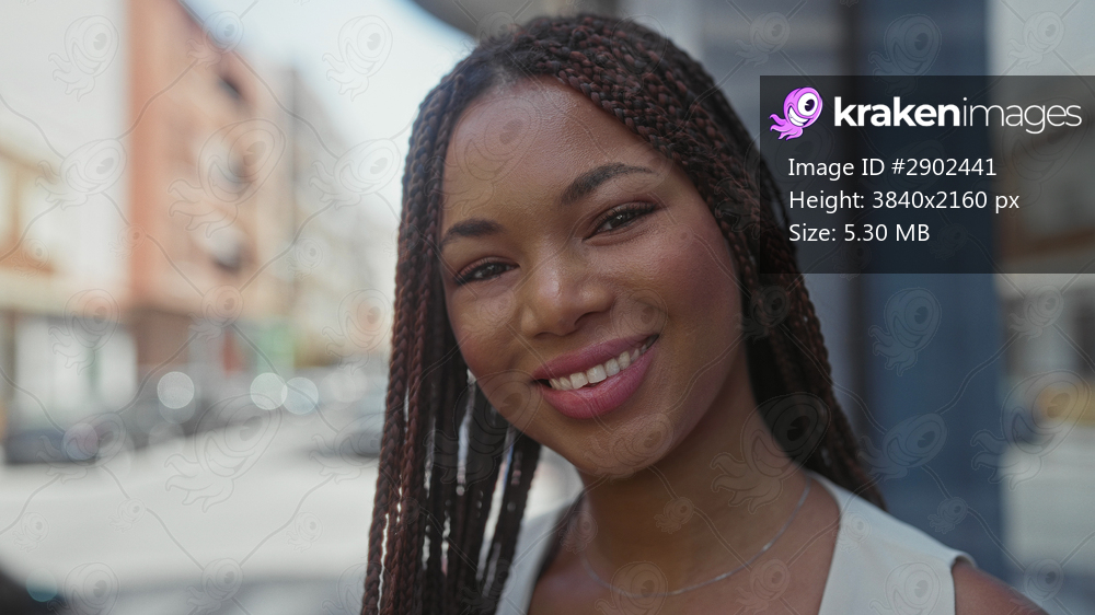 Young african american woman smiling, face forward with braided hair and silver necklace on sunny city street; joy confidence warmth.