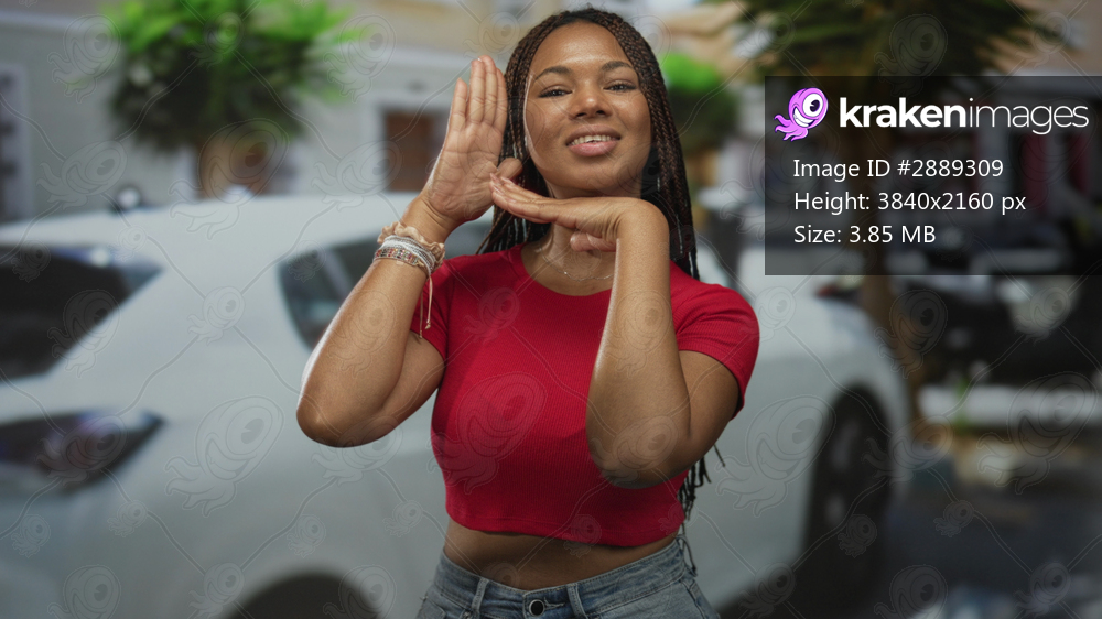 Young african american woman smiling and framing face with hands on street beside parked white car; playful confidence.