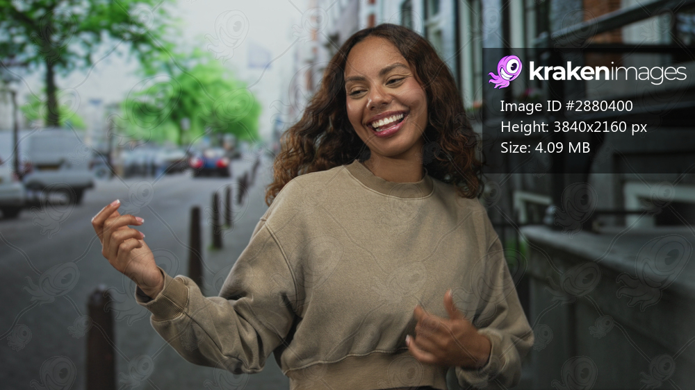 Young african american woman smiling and gesturing with bare hand while walking past building facades on a busy city street; joy carefree.