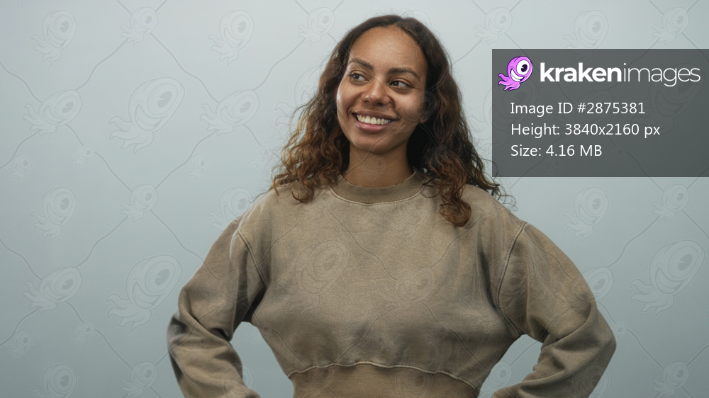 Young african american woman smiling with hands on hips wearing cropped sweatshirt in pale blue studio; confidence casual warmth.