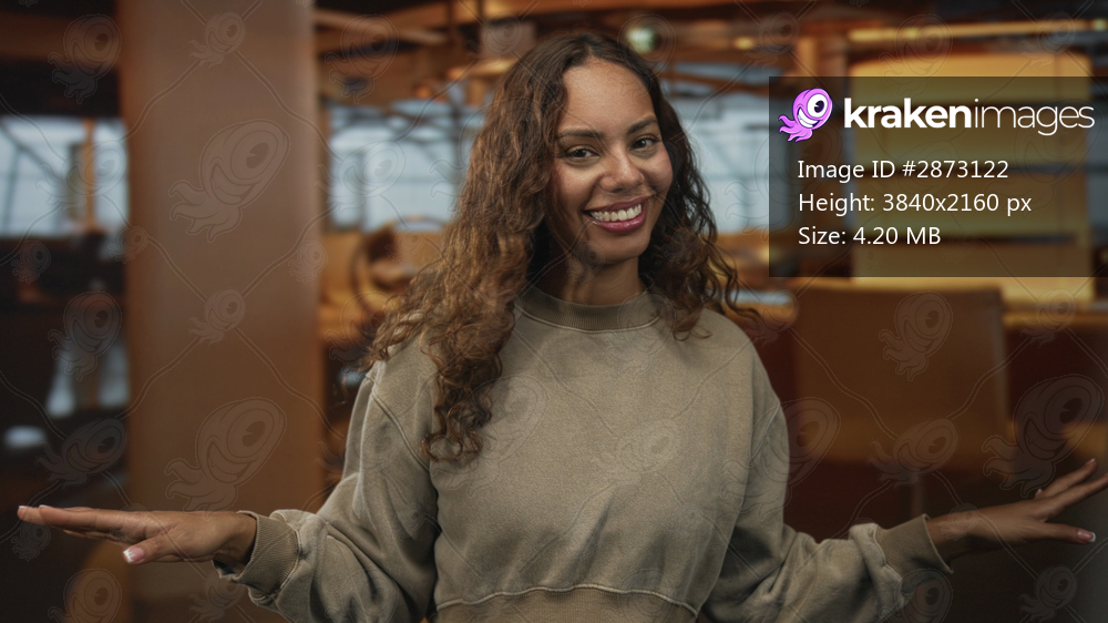Young african american woman smiling with hands out gesture in a restaurant building interior, wearing casual sweatshirt and showing curly hair; warm friendly joy. - Kraken Images