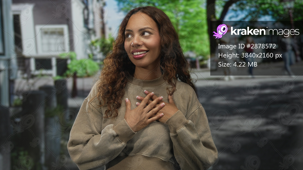 Young african american woman smiling with hands over chest on a city street wearing a beige sweatshirt and natural curls; gratitude warmth.