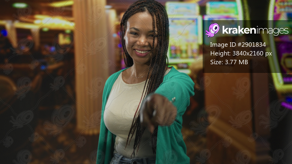 Young african american woman smiling points finger to camera by slot machine in casino building; joy celebration.