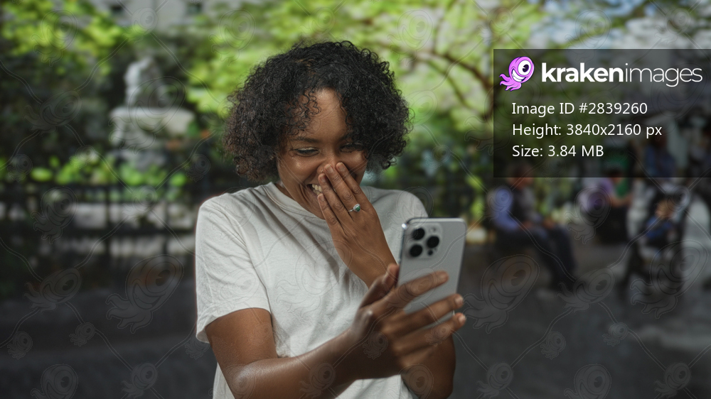 Young african american woman smiling while holding smartphone with hand on chest in lush green park; connection joy.