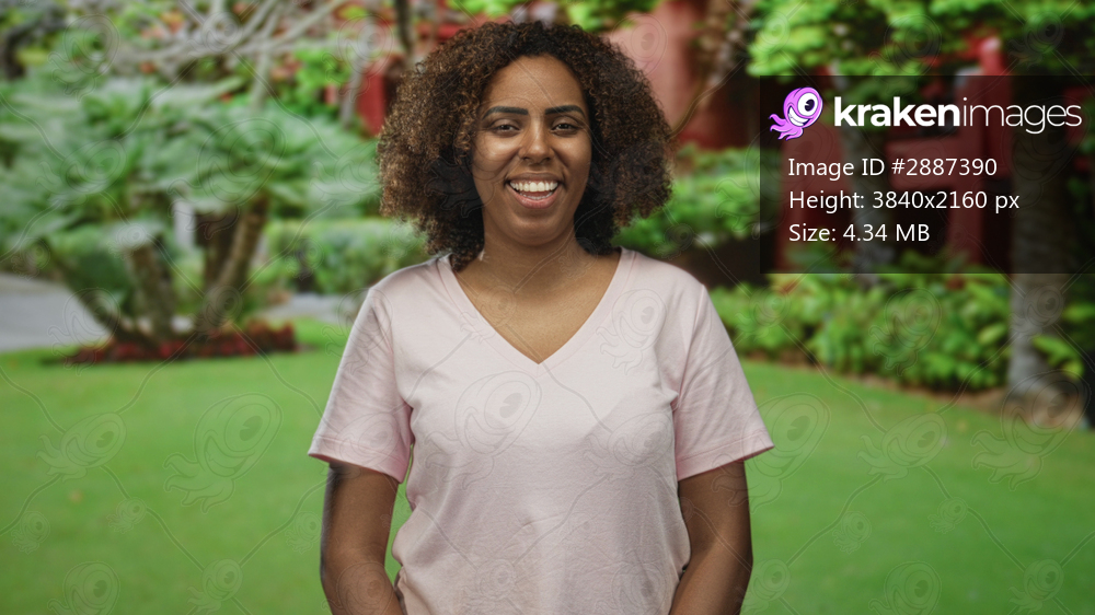 Young african american woman standing with face visible and smiling in front of a building; joy presence.