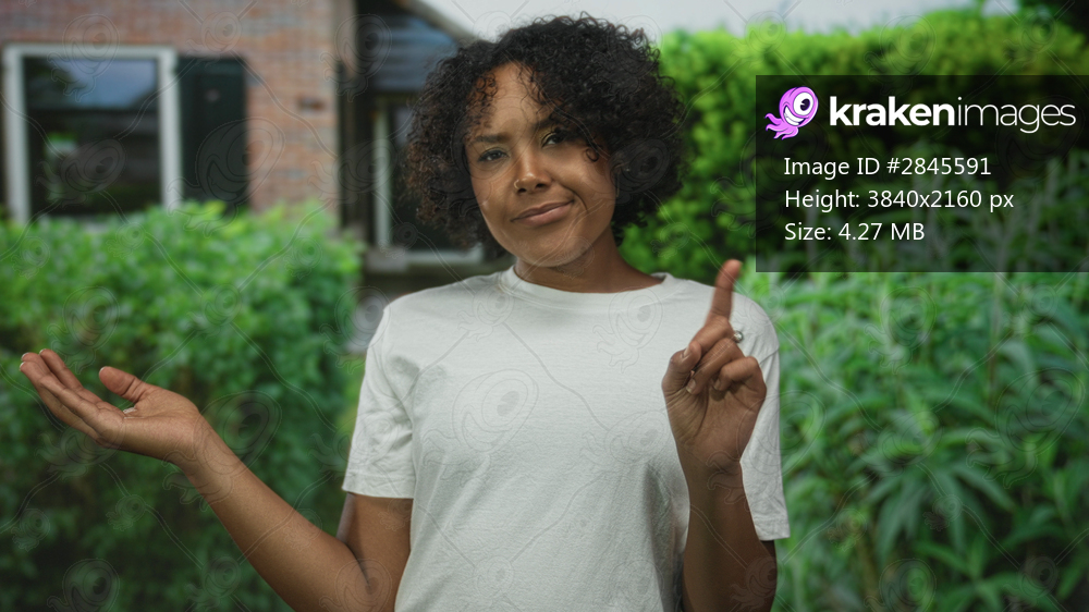 Young african american woman stands with an open hand gesture outside a brick building entrance in a lush garden; uncertainty.