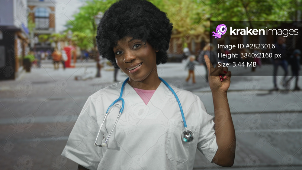 Young african american woman with stethoscope points finger upward on bustling city street; confidence care.