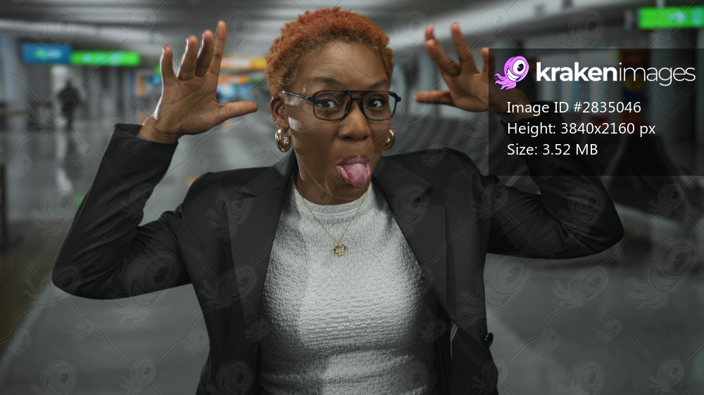 Young african american woman sticks out her tongue and raises both hands at a bustling airport terminal; mockery playfulness.