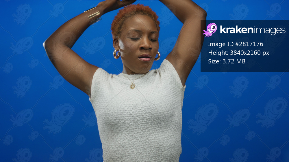 Young african american woman stretches bare arms with closed eyes in blue studio setting; relaxation.