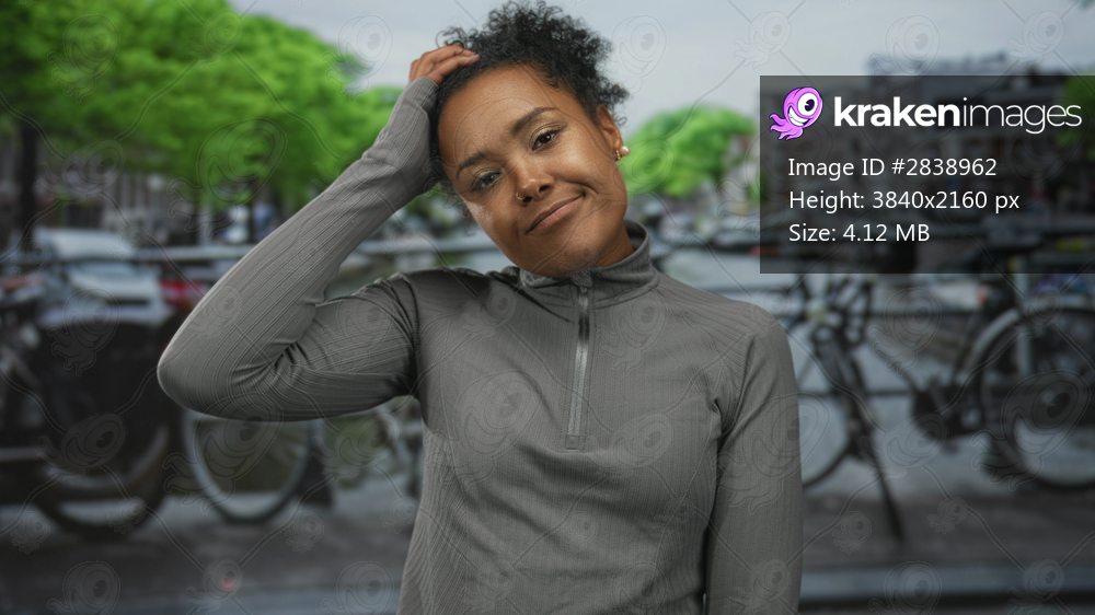 Young african american woman touches hair and smiles beside canal on city street; quiet contemplation.