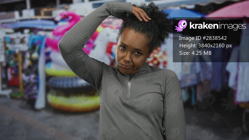 Young african american woman touches her curly hair beside market stalls on street; reflection confidence.