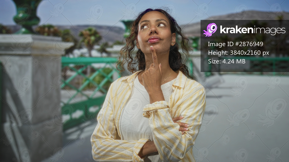 Young african american woman touching chin on street promenade by green railing and palm trees, sunlit walkway and distant hills; contemplation.