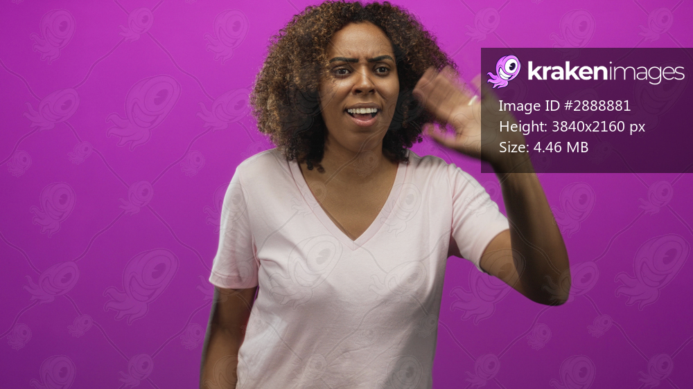 Young african american woman waving hands in magenta studio with visible palms and motion blur, wearing pale pink t shirt; surprised unease.