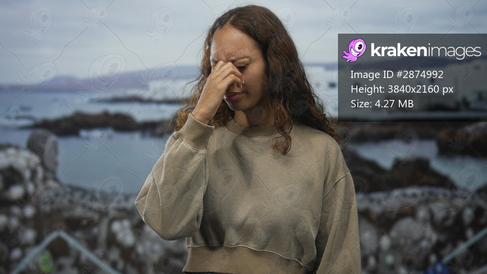 Young african american woman wearing a beige sweatshirt pinched nose and closed eyes while standing on a rocky coast near white buildings and a pier; disgust. - Kraken Images