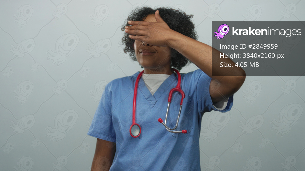 Young african american woman wearing blue scrub top with stethoscope raises hand to cover eyes in light grey studio; fatigue.