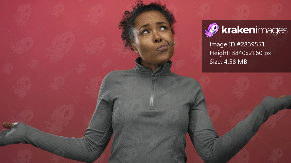 Young african american woman wearing casual gray top shrugs with extended arms in red studio; uncertainty.