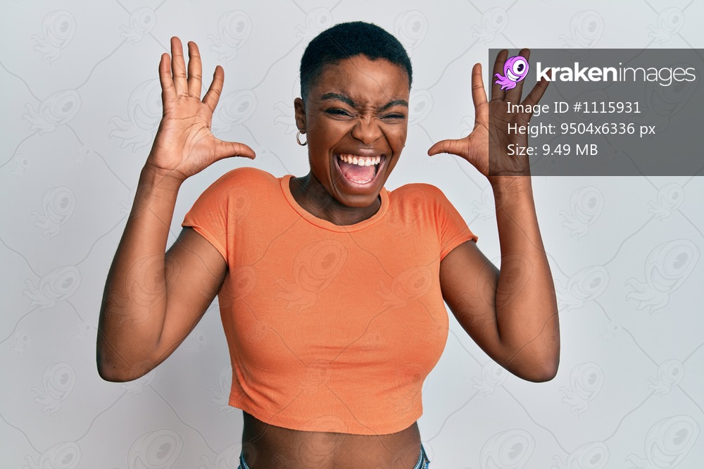 Young african american woman wearing casual orange t shirt celebrating mad and crazy for success with arms raised and closed eyes screaming excited. winner concept - Kraken Images