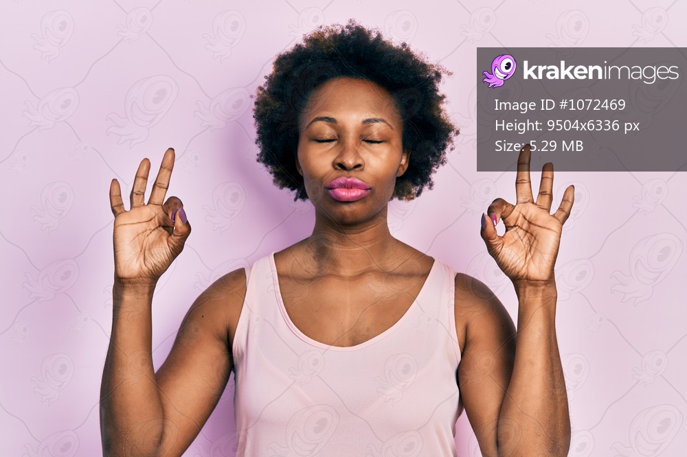 Young african american woman wearing casual sleeveless t shirt relax and smiling with eyes closed doing meditation gesture with fingers. yoga concept.