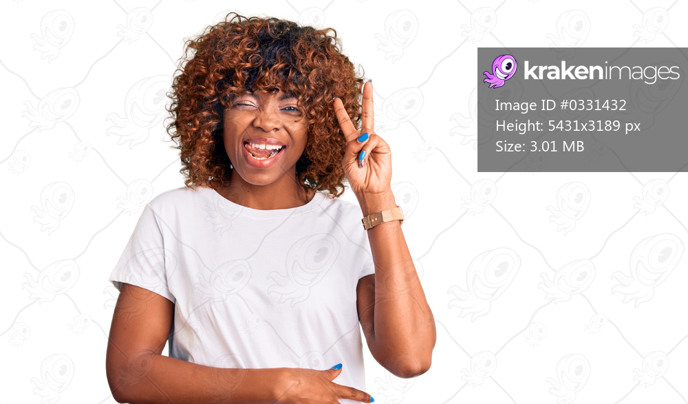 Young african american woman wearing casual white tshirt smiling with happy face winking at the camera doing victory sign. number two.