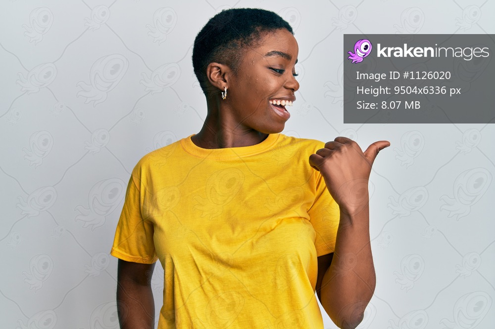 Young african american woman wearing casual yellow t shirt pointing thumb up to the side smiling happy with open mouth