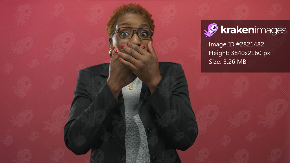 Young african american woman wearing glasses and blazer covers mouth with hands in red studio; surprise.