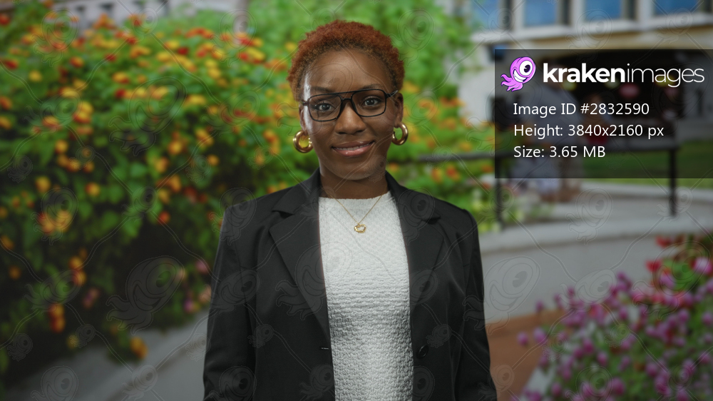 Young african american woman wearing glasses and blazer looks sideways in front of building; confidence.