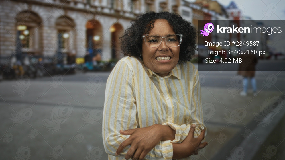Young african american woman wearing glasses crosses arms on street lined with stone buildings; anxiety.