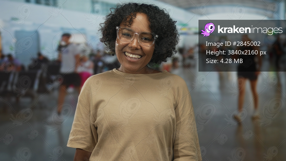 Young african american woman wearing glasses poses facing camera with warm smile in airport terminal; optimism.