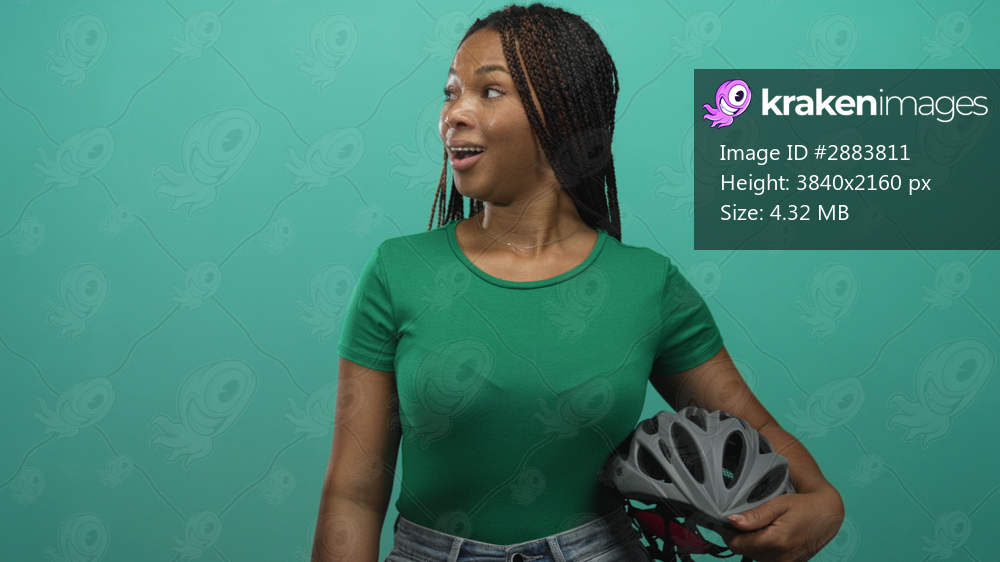 Young african american woman wearing green t shirt and holding bicycle helmet in green studio; confidence empowerment fitness.