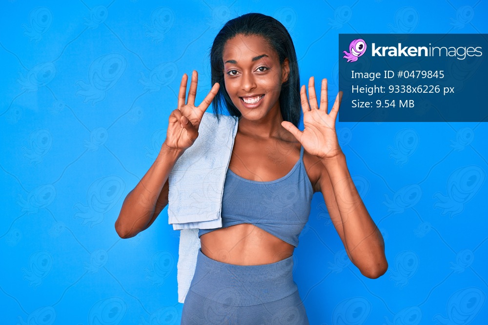 Young african american woman wearing sportswear showing and pointing up with fingers number eight while smiling confident and happy.