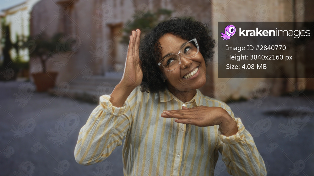 Young african american woman wearing striped shirt smiling frames air with hands on old town cobblestone street; playfulness.