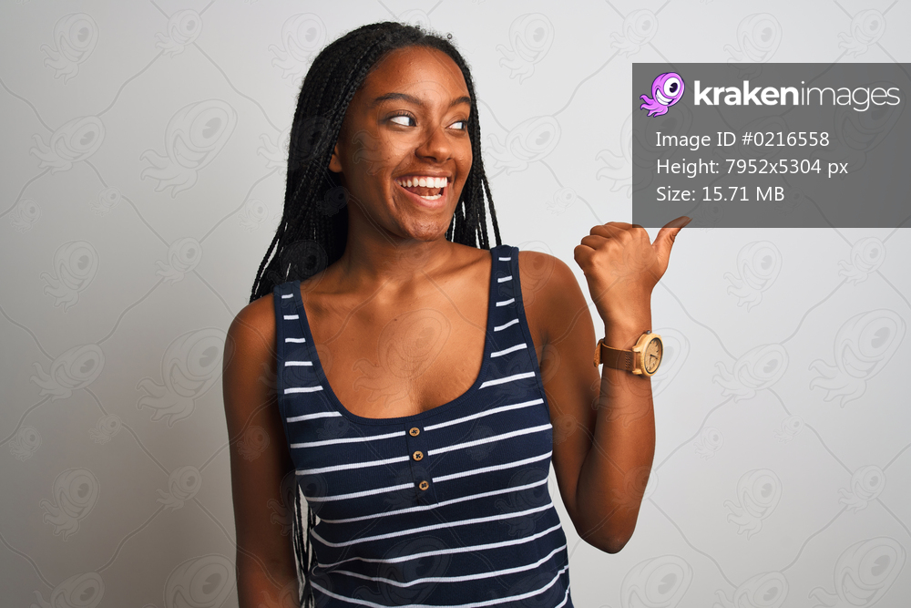 Young african american woman wearing striped t-shirt standing over isolated white background smiling with happy face looking and pointing to the side with thumb up. - Kraken Images
