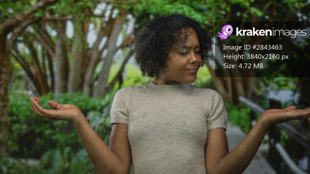 Young african american woman wearing sweater holds both palms up gesture on winding forest path; indecision.