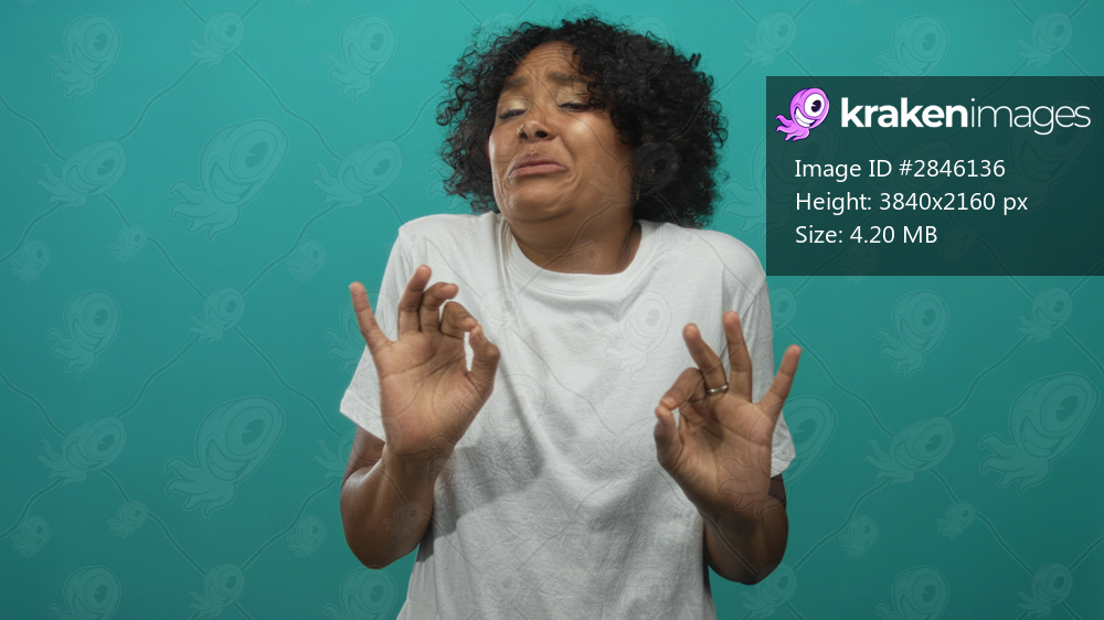 Young african american woman wearing white t shirt cringing while holding ok sign in a teal studio; disgust.