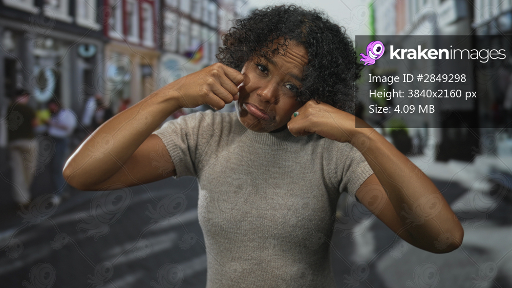 Young african american woman wipes tears from her eyes on a busy outdoor city street beside blurred pedestrians; sadness.
