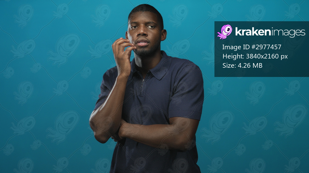 Young african man with hand to cheek and arm crossed holding phone to ear against blue studio backdrop; thoughtful reflection.