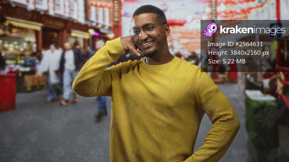 Young african man with hand to ear making a phone call gesture on a crowded street wearing yellow sweater and glasses; connection joy.