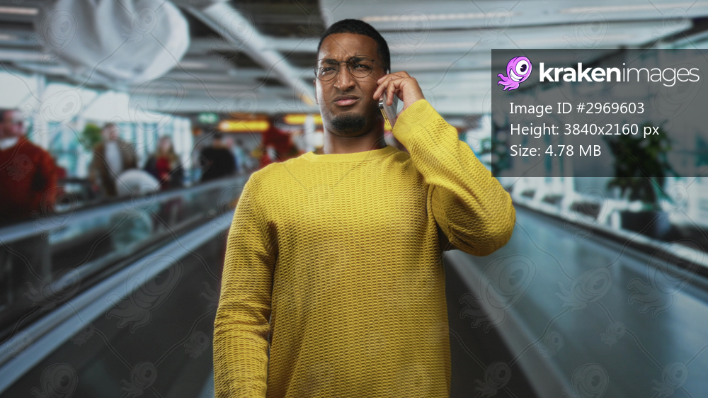 Young african man with smartphone to ear on airport moving walkway, frowning in yellow sweater and glasses; frustration travel stress.