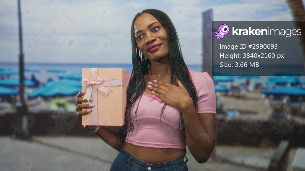 Young african woman holding a pink present with hand on chest at a busy beach promenade, smiling while posing by blue umbrellas; gratitude celebration warmth. - Kraken Images