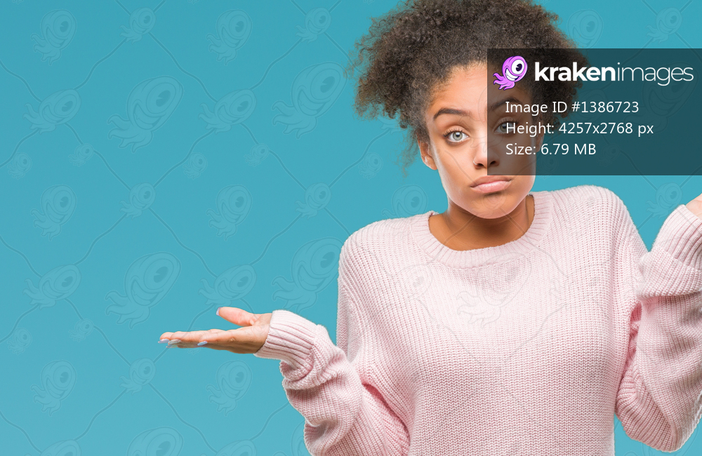 Young afro american woman wearing winter sweater over isolated background clueless and confused expression with arms and hands raised. Doubt concept.
