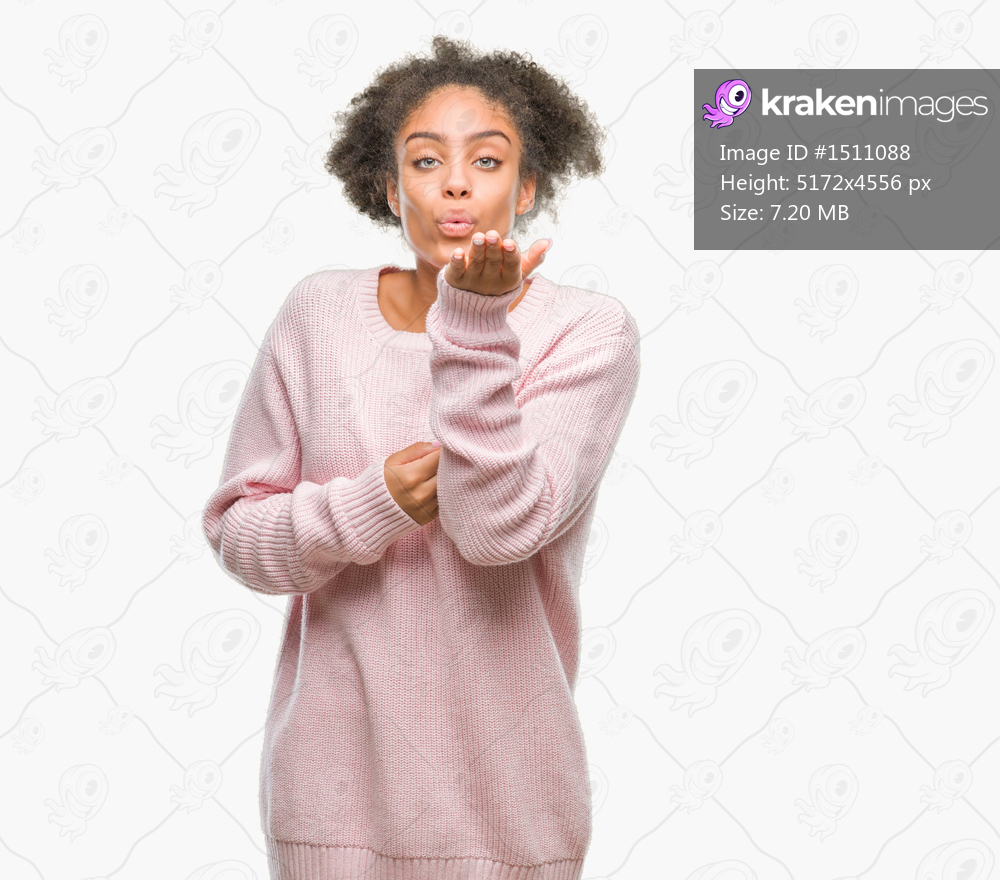 Young afro american woman wearing winter sweater over isolated background looking at the camera blowing a kiss with hand on air being lovely and sexy. Love expression. - Kraken Images