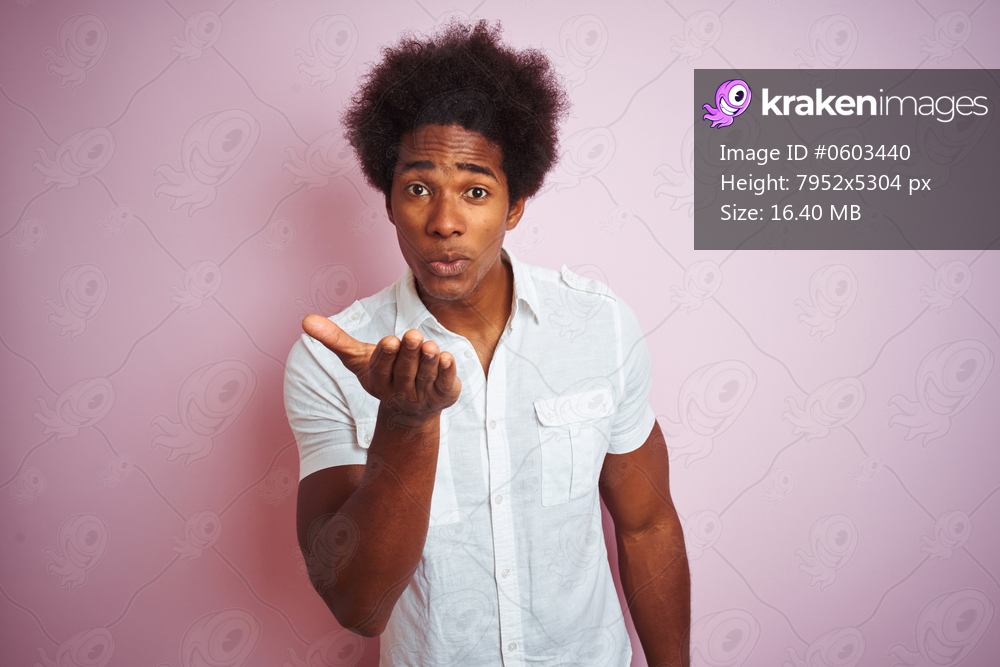 Young american man with afro hair wearing white shirt standing over isolated pink background looking at the camera blowing a kiss with hand on air being lovely and sexy. Love expression. - Kraken Images