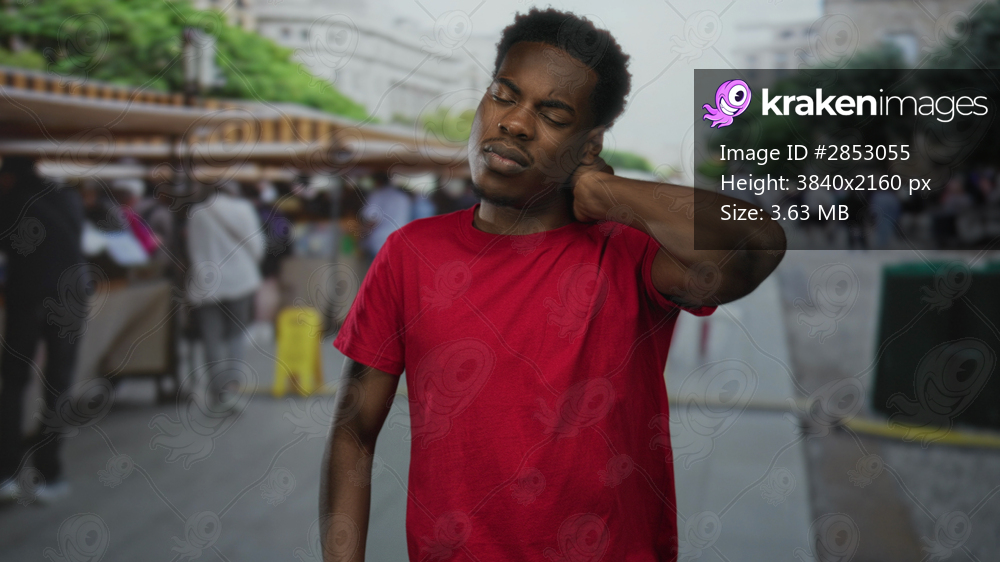 Young american man wearing red tshirt touching neck in street market amid blurred stalls;tension strain fatigue.