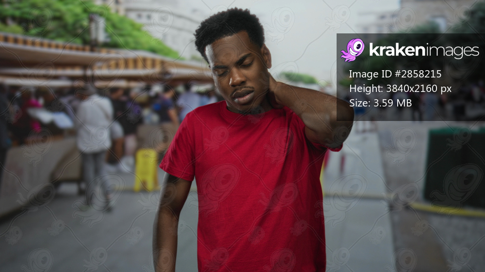 Young american man wearing red tshirt touching neck in street market amid blurred stalls;tension strain fatigue.