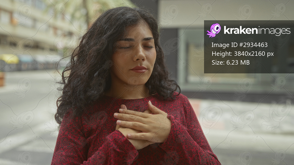Young arab brunette woman with hands on chest and eyes closed on a city street near a storefront, standing calmly with palms over heart; gratitude reflection. - Kraken Images