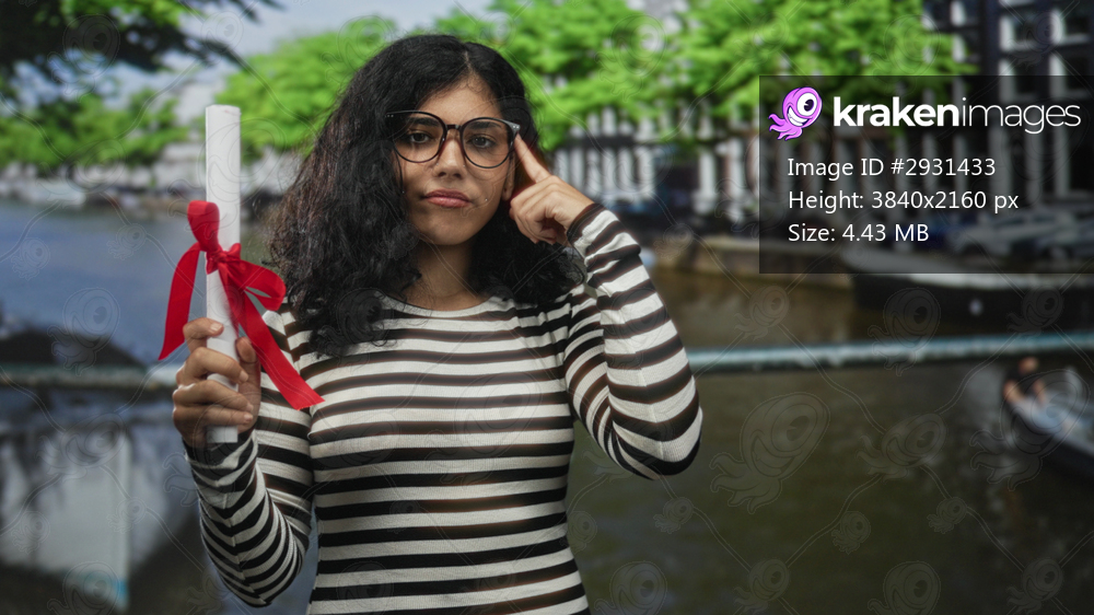 Young arab brunette woman holding diploma with red ribbon and pointing finger on street in amsterdam; confidence.