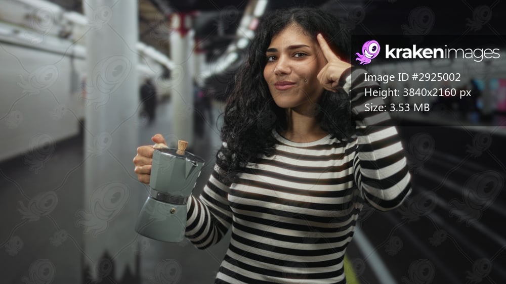Young arab brunette woman holding moka pot in station building points finger to head while smiling and offering coffee; thoughtful coffee ritual urban pause. - Kraken Images
