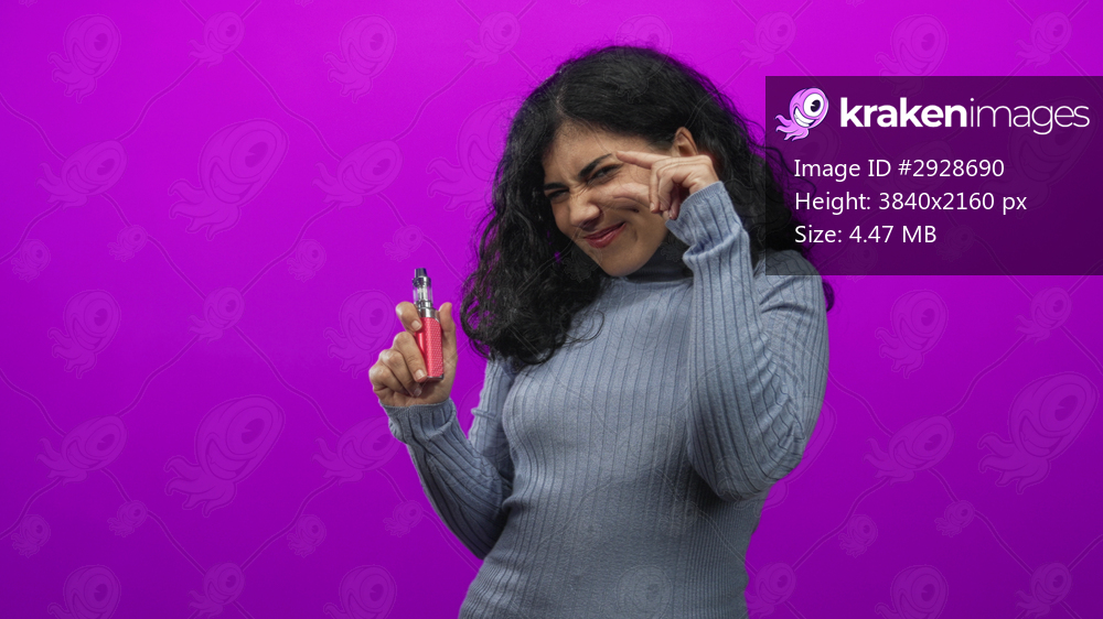 Young arab brunette woman holding red vape and pinching fingers near face in studio with purple backdrop; playful.