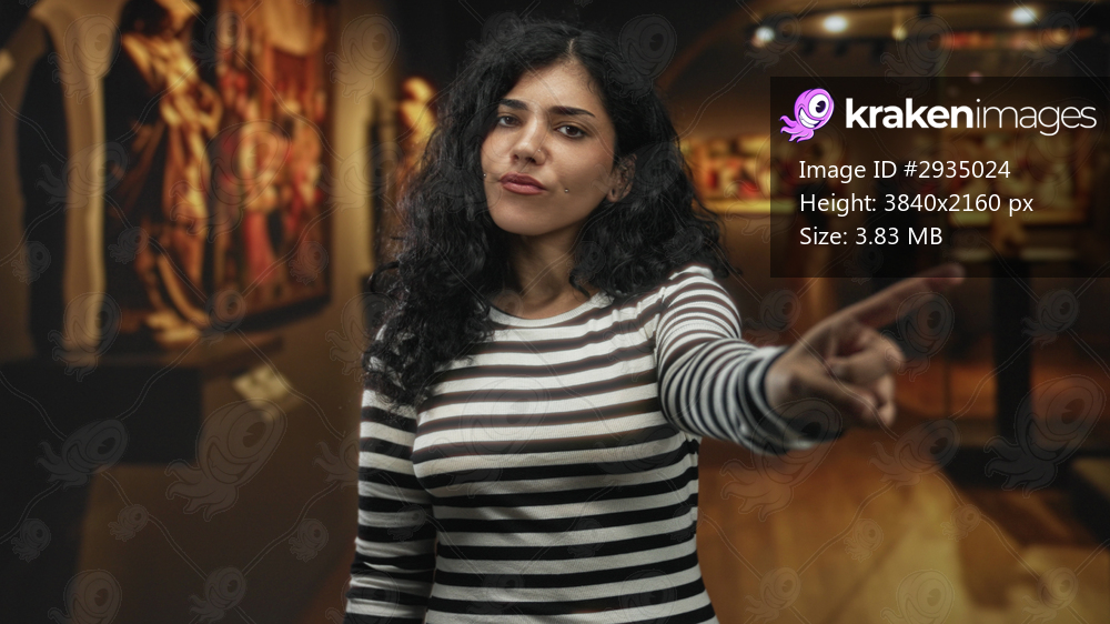 Young arab brunette woman in striped shirt points finger at painting in gallery with blurred visitors and floor; art critique disapproval.