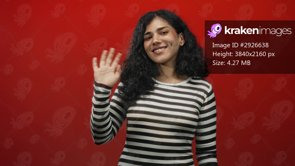 Young arab brunette woman waving hand in studio against red backdrop wearing black and white striped top; friendly greeting.